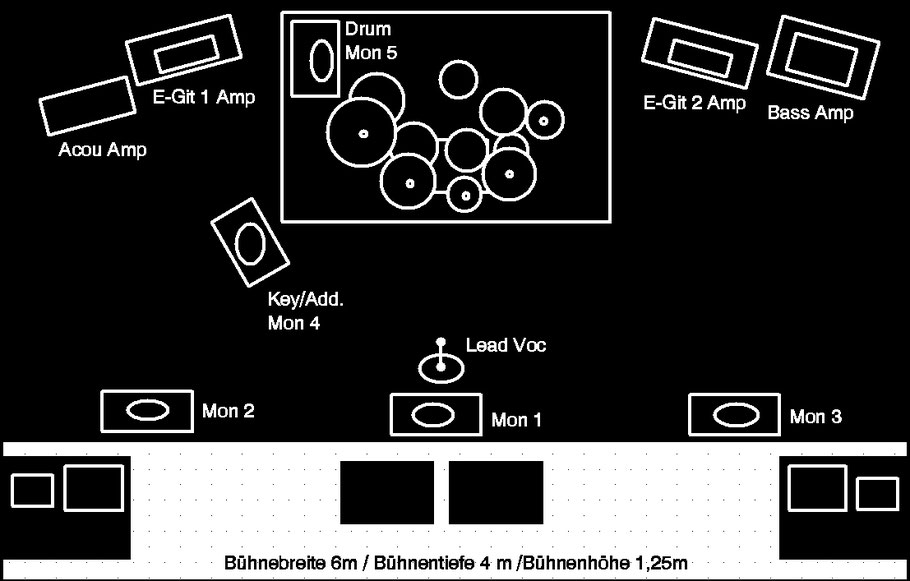 A: Aus organisatorischen Gründen, kein IN-EAR! Das Monitoring läuft klassich über 3 Frontmonitore, einen Drum-Monitor und einen Keyboard Monitor (additional 5th) ab.
